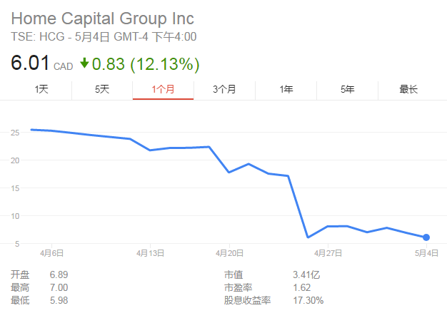 这时,公司不得不以22亿加元(约15亿美元)的紧急信贷额度进行求助。然而这一消息更加剧了储户的恐惧心理,新一轮的恐慌性踩踏继续上演,而HCG的股价也开始出现暴跌,周三一天之内,其在多伦多交易所的股票暴跌61.9%;同时储户资金仍在快速流失。