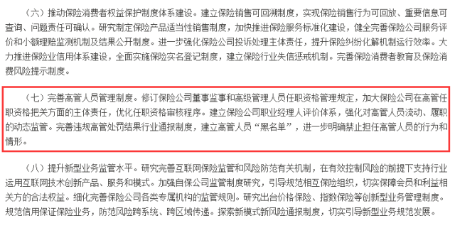 保监会在印发的《关于弥补监管短板构建严密有效保险监管体系的通知》中提出抓住八大重点领域,堵塞制度漏洞,其中包括要完善高管人员管理制度。修订保险公司董事监事和高级管理人员任职资格管理规定,加大保险公司在高管任职资格把关方面的主体责任,优化任职资格审核程序。建立高管人员“黑名单”,进一步明确禁止担任高管人员的行为和情形。
