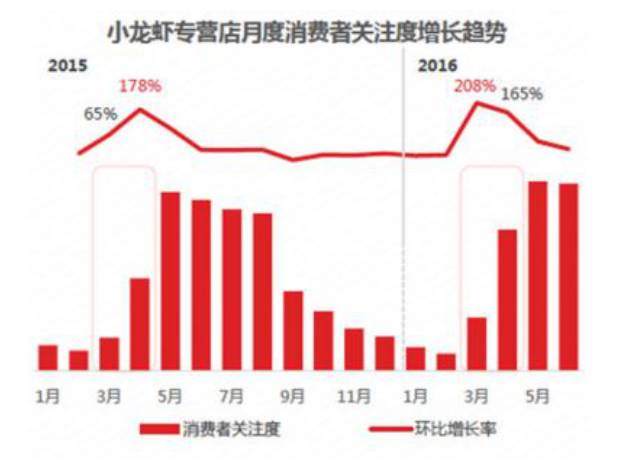 此外,在一线城市,大量以小龙虾为主题的餐饮店也正兴起。美团数据显示,仅2016年第二季度,小龙虾专营店新增数量同比上涨33%,总数量达到了17670家,是肯德基中国门店数量的三倍。