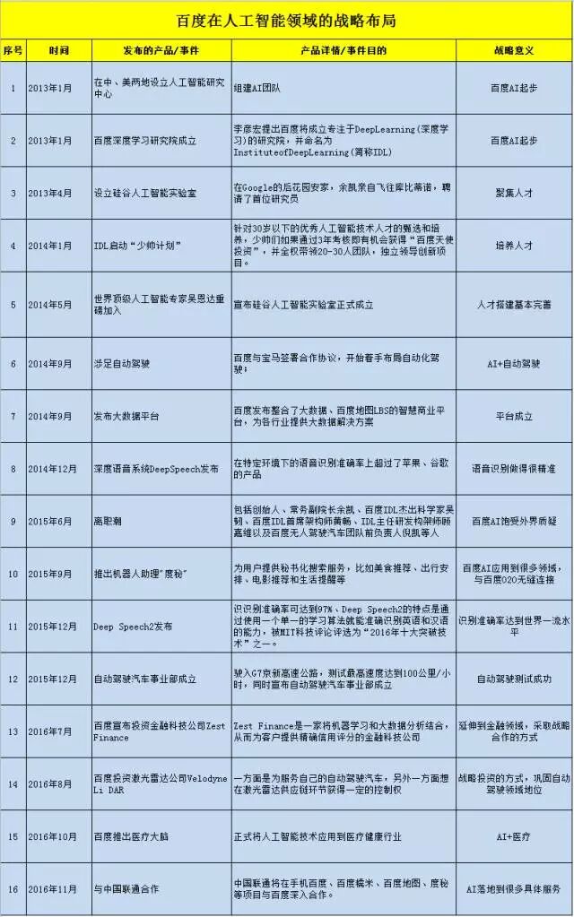 百度“AI”先行,发展非常的迅速。CEO李彦宏在多个场合公开表示:人工智能将成为百度未来增长的新引擎,涵盖所有产品和服务。业内有观点认为,人工智能的最高形式是机器人,机器人最高等级的是无人驾驶,百度选择了最难走的无人驾驶。