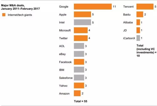 巨头并购较少。2011年至今,中国的AI创业公司被以BAT收购的数量约为10起。在同一时期,美国AI创业公司大多被以谷歌为代表的科技巨头收购案约55