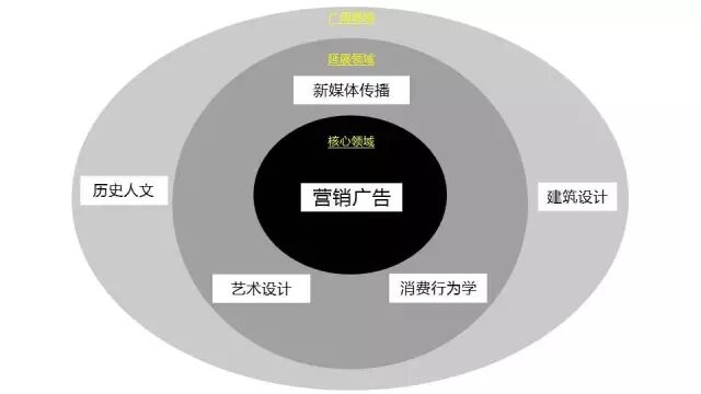 那么如何做到由专才向通才的转变?Boy 的经验是建立自己的知识关联图谱。拿我自己举例,我的主业是广告和营销,围绕着这个主业我可以拓展其他相关的知识领域,如下图所示: