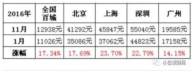 从表中可以看出,2016年中国的房子均价上涨了17.34%,远高于社科院10%的数据,尤其是上海、深圳等房价上涨的龙头城市涨幅超过20%,虽然12月份受限购、限贷新政影响房价有微幅调整,但是变化不是很大!