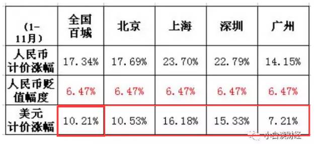 如下表,剔除2016年1-11月人民币贬值6.47%的幅度后,真实的房价上涨应该是10.21%。