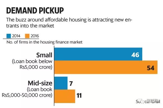 经济适应房的巨大需求,在吸引了众多的相关提供资金的企业。在印度国内,从2014年到2016年,两年间小型住房金融领域公司的数量从46家提高到54家;中型公司从7家提高到11家。