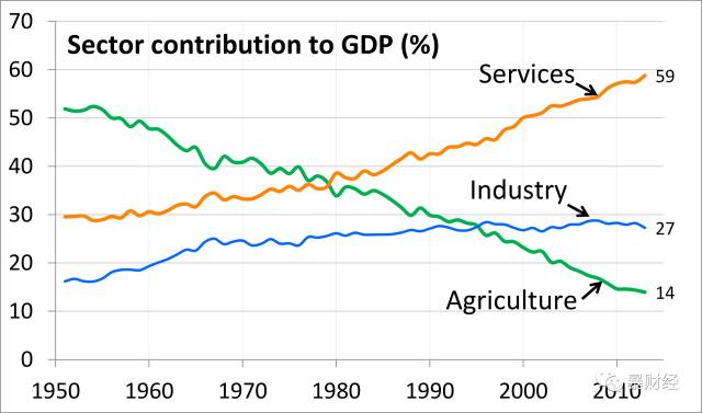 印度这个国家的发展模式比较奇怪,此前的发达国家一般是以第一产业为重,然后第二产业成为主流,最后第三产业占比最多。而印度,自始至终,第二产业,即制造业就没起来过,反倒是属于第三产业的服务业,比如IT、软件外包、医药等领域一枝独秀。