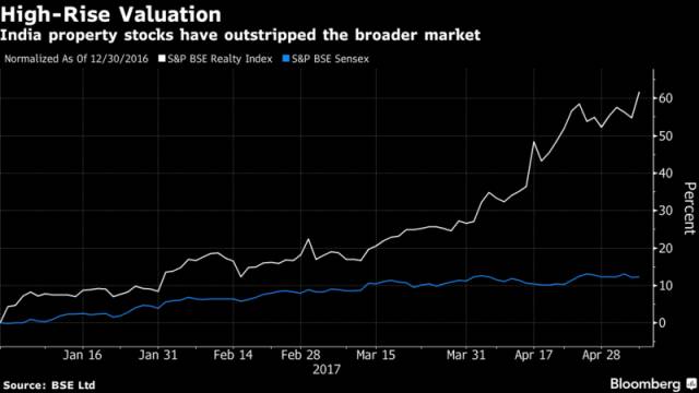 据彭博社,印度的地产行业股票在2017年增长幅度高达60%,远远跑赢印度股市整体的表现(印度股市2017年增长超过10%)