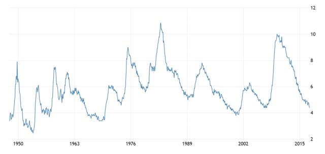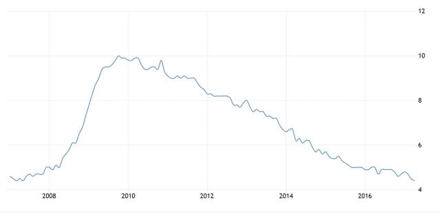 上图是美国最近10年失业率的走势,金融风暴一度让失业率达到了10%,但奥巴马的8年有效地降低了失业率,所以奥巴马政绩是不错的。