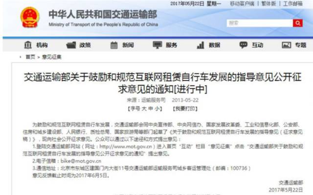 5月22日,交通运输部官网发布了《关于鼓励和规范互联网租赁自行车发展的指导意见(征求意见稿)》,向全社会进行为期两周的公开意见征求活动。