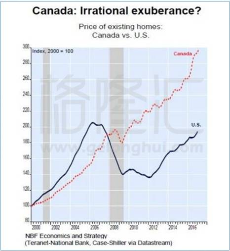 加拿大的房价在2008年美国次贷危机后只是小幅下调后就一路绝尘向上,早已经炒作到脱离居民经济能力基本面。近期加拿大皇家银行的研究报告就指出,大多伦多地区在去年第四季度的住房负担能力,已处于上世纪80年代中期以来第二差的水平。