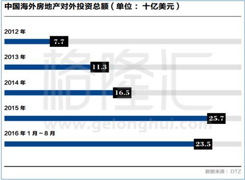 根据胡润发布的《2017中国高净值客户海外置业展望》的数据显示,中国海外房地产投资总额不断增加,且增速明显加快,2016年前八个月就达到235亿美元。