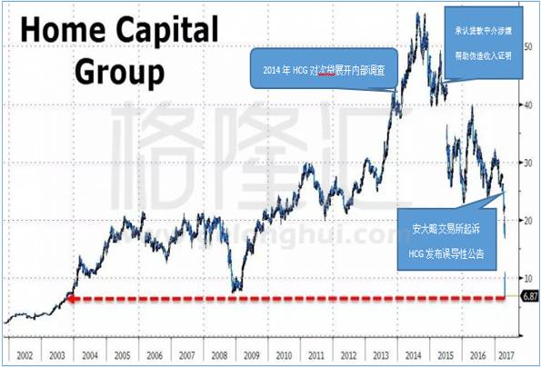 先回顾下HCG股价崩盘过程。早在2014年就HCG对“不正常”的抵押贷款申请展开了内部调查,在2015年2月就停止了与部分中介的交易,但是当时没有披露是因为中介涉嫌欺诈。直至在2015年7月HCG才承认因为公司发现他们涉嫌帮助借款者伪造收入证明,切断了与45个抵押贷款的中介的联系,而涉及此次伪造收入证明事件的房贷金额大概达到10亿加元,HCG股价随即快速下跌。