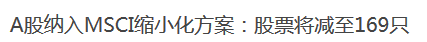 新方案建议只纳入可以通过沪港通和深港通买卖的大盘股,计划将A股在MSCI中国指数的建议权重从3.7%降至1.7%,在MSCI新兴市场指数中的权重从1%降至0.5%。(详见《MSCI原文抢先看,A股“入摩”新变化全在这里》)