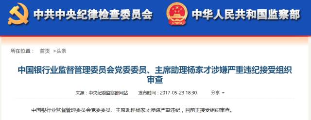 据中纪委监察部网站5月23日消息,中国银监会党委委员、主席助理杨家才涉嫌严重违纪,目前正接受组织审查。