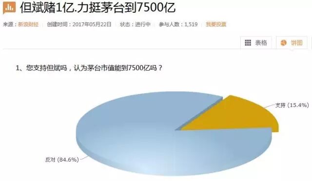 实际上但斌的言论也并未得到大多数投资者的认可,在周一新浪财经一项关于“但斌赌1亿,力挺茅台”的调查显示,支持但斌认为一年后贵州茅台股价能到600元的投资者只占15.4%,而高达84.6%的投资者并不看好茅台后市。