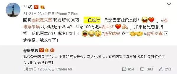 对于但斌的言论,上海砥俊资产总经理梁瑞安指出:“贵州茅台2018年底如果不到600元/股,你就捐出50万给慈善机构。”但斌却立刻接棒称:“我愿赌1000万,1亿也行!”。