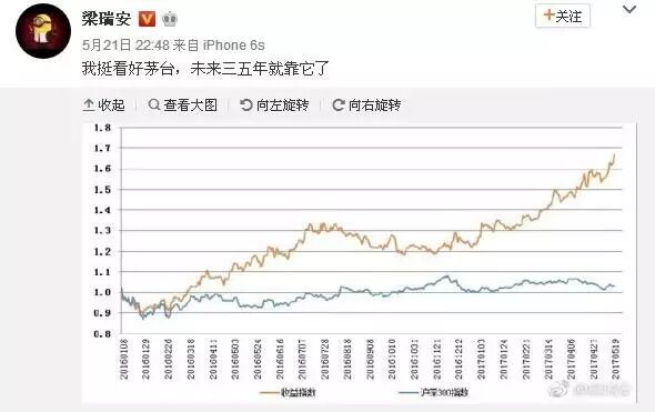 实际上梁瑞安也在微博上贴出其收益曲线图,并表示“挺看好茅台,未来三五年就靠它了”。