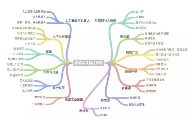 首先我提醒大家关注这张图。未来几十年的发展方向都蕴藏在这张图里。有这些方向:人工智能与机器人、电子与计算机、军事、汽车与交通、航天航空、先进工业制造、互联网与大数据、新金融、健康产业、绿色环保、新能源、新农业、新材料。
