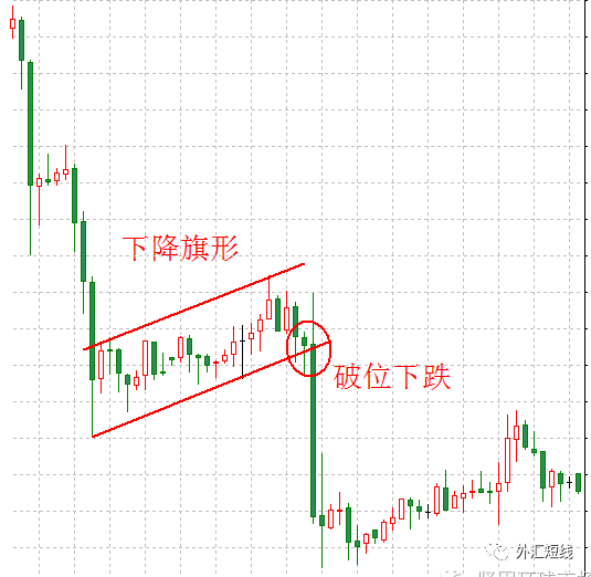 下降旗形则正好相反,短期价格形成一个略微上倾的整理运动,将高点和低点分别连接起来,就可以画出二条上倾的平行四边形,这就是下降旗形运动。在下跌趋势中所形成的旗形,其形状为上升时图形之倒置呈上飘状。在急速的直线下降中,成交量增加达到一个低点,然后遇支撑开始反弹,不过反弹幅度不大成交量减少并不配合,这是空头市场中的多头在弱势抵抗。但得不到市场大多数投资者的认同,价格经过一段时间旗形整理,最终下行放量破位低点连续支撑线,价格继续下跌。(如下图所示)