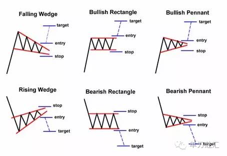 这里我们列举了一些持续形态,主要有楔形、矩形、尖旗形形态。